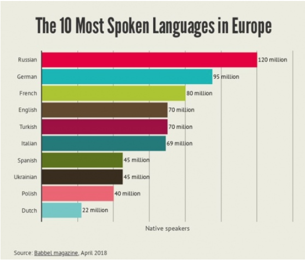 Англійською та турецькою мовами від народження говорять 70 мільйонів жителів Європи. Вони зайняли четверте і п’яте місця відповідно.