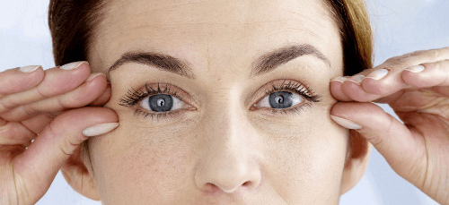 Безіменним пальцем обережно промассіруйте області під очима, натискаючи по одній точці і поступово просуваючись від внутрішнього куточка ока до зовнішнього при масажі верхньої повіки і навпаки при масажі нижнього.
