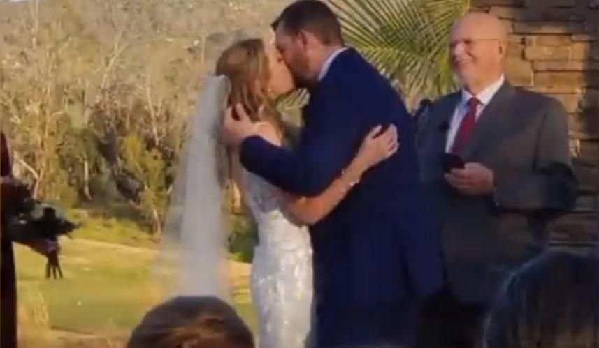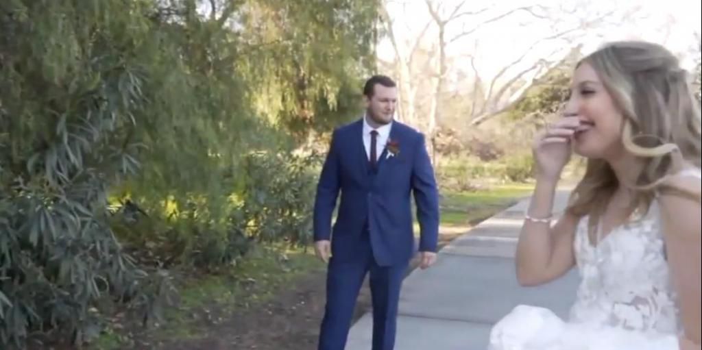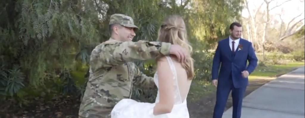 Молодята поділилися фотографіями зі свого весілля, на яких помітно, як вони, нічого не підозрюючи, позують фотографам і оператору. Але несподівано до них назустріч вийшов Ей-Джей у військовій формі. Ось і сюрприз!