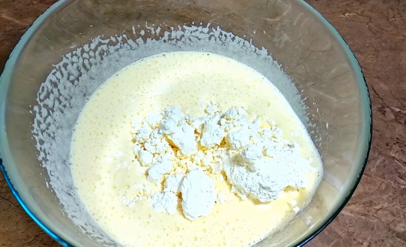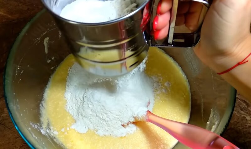 Далі просій борошно з розпушувачем і також додай до решти інгредієнтів. Знову перемішай весь вміст миски і переконайся в тому, що тісто вийшло досить густим.