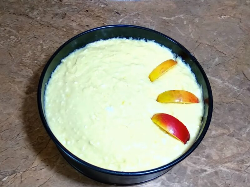 Потім залишається тільки відправити заготовку в розігріту до 180 градусів духовку, розподіливши тісто за формою для випікання і виклавши зверху очищені порізані яблука.
