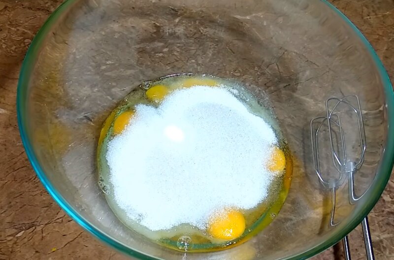 Насамперед візьми велику глибоку миску і вбий в неї яйця. Потім додай в миску цукор і гарненько збий яйця до повного його розчинення.