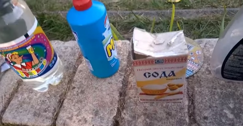 В першу ємність поклади 5 столових ложок соди. В іншу – приблизно 5 чайних ложок лимонної кислоти. Також в пляшку з лимонною кислотою даси близько 2-3 столових ложок миючої рідини.