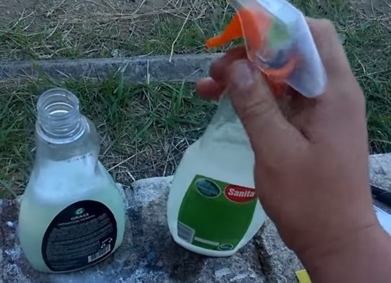 Тепер зверху потрібно розпорошити рідину з другої ємності, щоб сода і лимонна кислота вступили в реакцію. Новоутворена піна легко розчинить навіть найскладніші забруднення, і все, що залишиться зробити, – просто стерти бруд вологою ганчіркою.