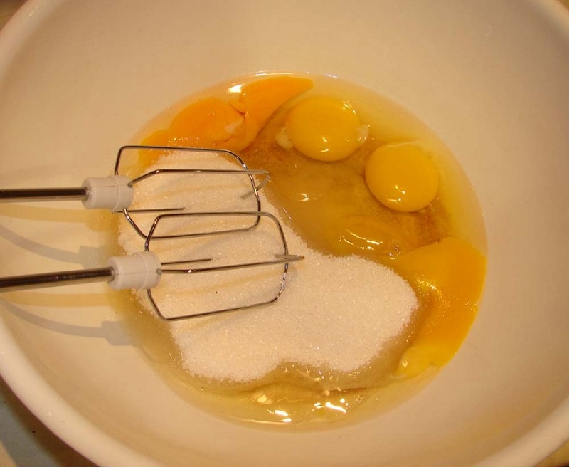 Збивати звичайний і ванільний цукор, яйця, поки не пропаде хрускіт цукру під віночками міксера.
