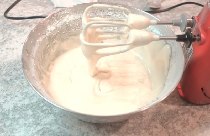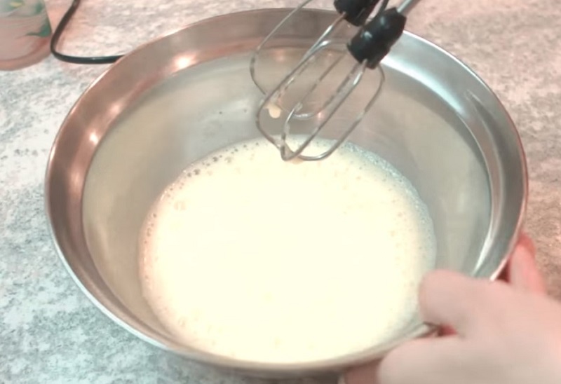 Просій борошно через сито і додай в неї розпушувач. Після цього підсипай борошно невеликими порціями і перемішуй. Тісто має вийти як густа домашня сметана. Кількість борошна можна регулювати на око.