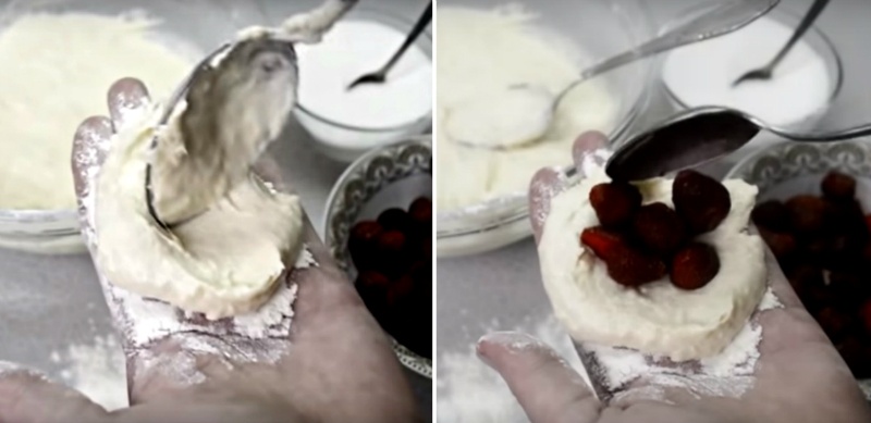 В одну руку наберіть трохи борошна, викладіть на долоню столову ложку з верхом тіста. У центрі покладіть трохи ягід. Пальці іншої руки пріпиліть борошном і швидко защипніть краї. Відразу викладайте пиріжки на розігріту з олією сковороду.