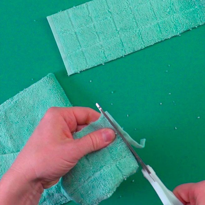 Кладемо рушник і розрізаємо його на смуги по ширині приблизно 6-8 см. Обов’язково видаліть підшиті краї рушника.