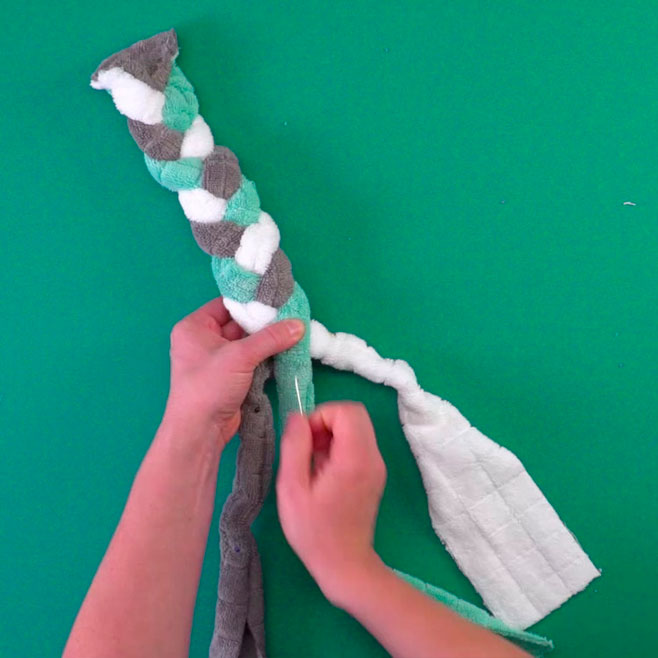Потім з’єднуємо і зшиваємо по вузькому краю три полосочки з різних рушників. Потім з’єднуємо краї кожної смужки і скручуємо в трубочки і зшиваємо.
