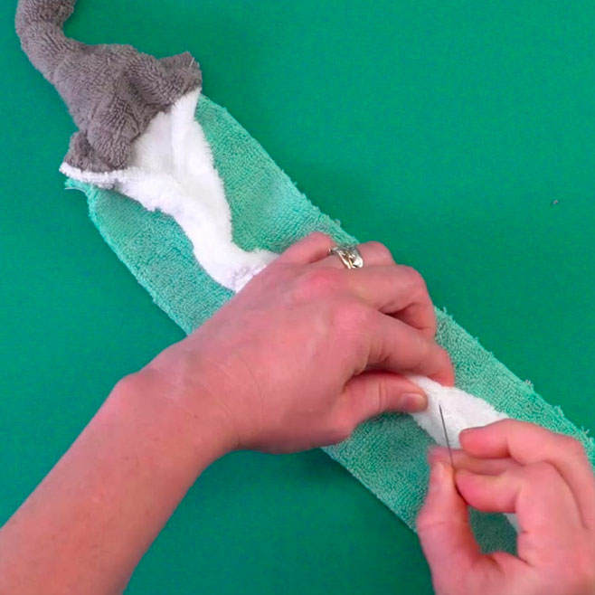 Потім з’єднуємо і зшиваємо по вузькому краю три полосочки з різних рушників. Потім з’єднуємо краї кожної смужки і скручуємо в трубочки і зшиваємо.
