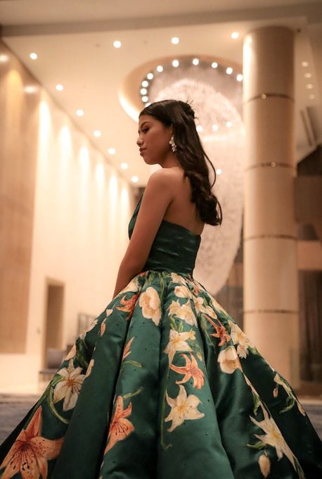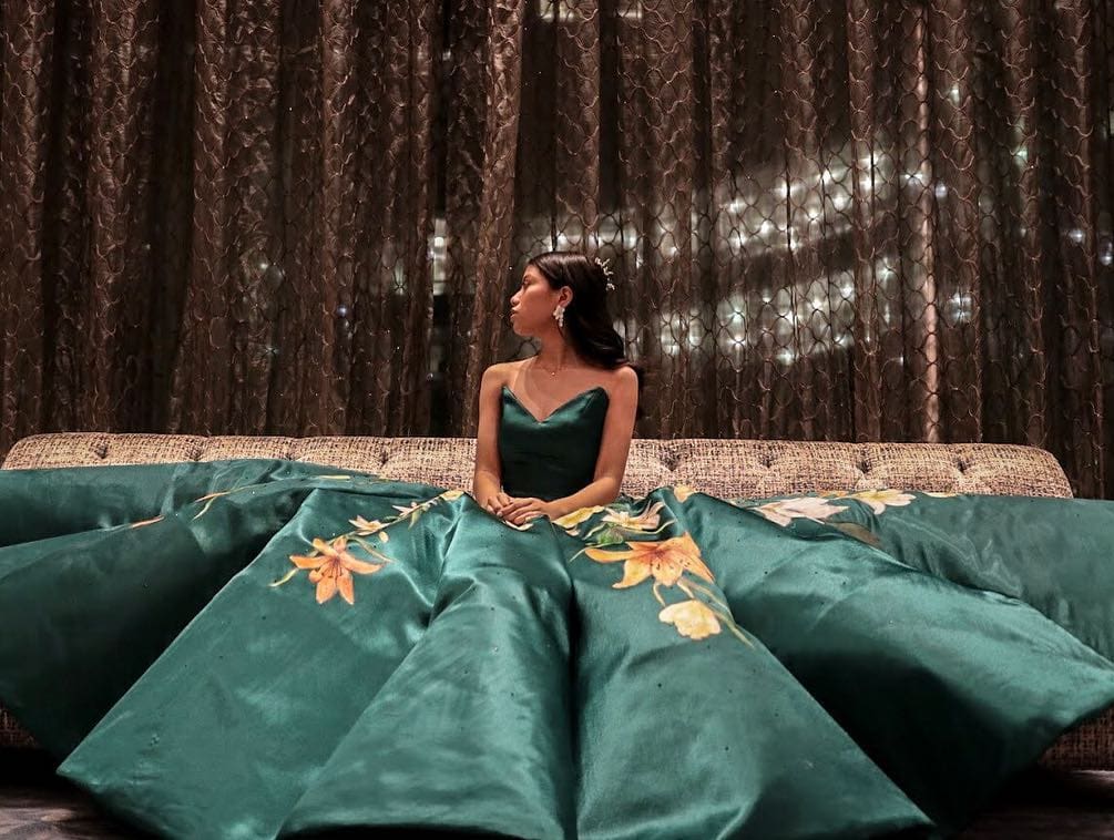 Для цього філіппінка використала дванадцять метрів тканини смарагдового кольору. Її вона прикрасила стразами і ніжними тигровими ліліями, які намалювала сама. Як зізналася сама Сіара, ці яскраві квіти прекрасно відображають її натуру.