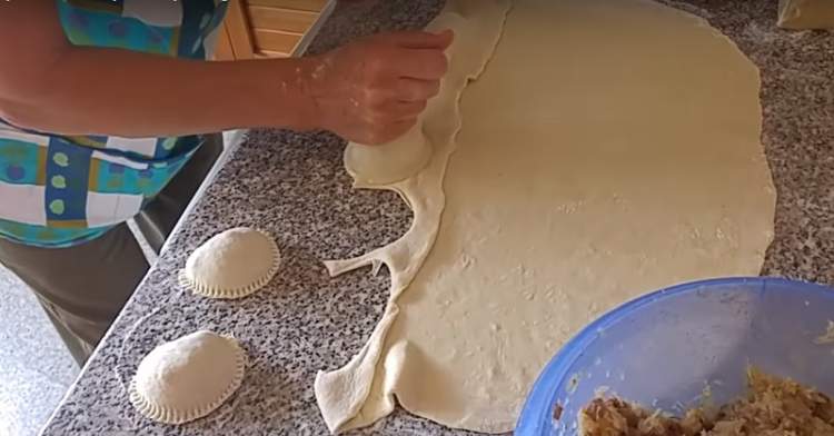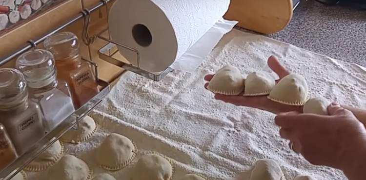 Фарш потім накривається вільним краєм. Тісто притискається до фаршу, щоб трішки сформувати пельмені.