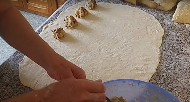 Викладіть столовою ложкою фарш на 5-7 см від краю тіста.