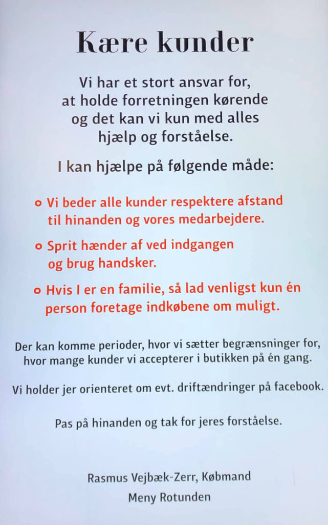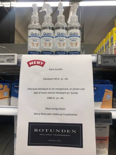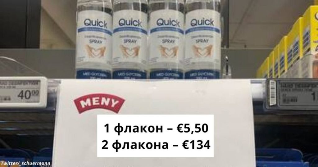 Відповідно до законів багатьох країн, в тому числі і Данії, магазини не можуть обмежувати кількість придбаних товарів. Тому адміністрація супермаркету «Meny» вдалася до невеликої хитрості, запропонувавши купити відвідувачам один антисептик за ціною в 40 крон, а два – вже за 1000.