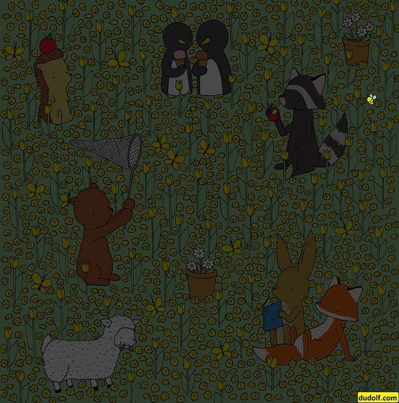 Барвиста картинка, створена ілюстратором Гергель «Dudolf» Дудаш з Угорщини, спонукає людей розшукати джмеля який добре сховався серед мультяшних тварин на квітучому полі.