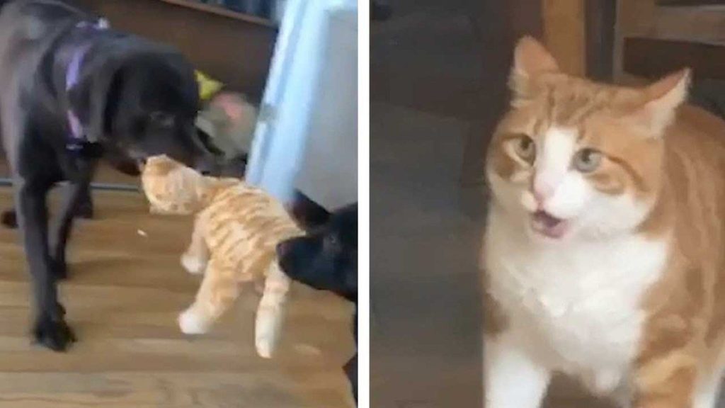 Безцінна реакція кота, коли він побачив, що зробили з його іграшковою копією двоє песиків