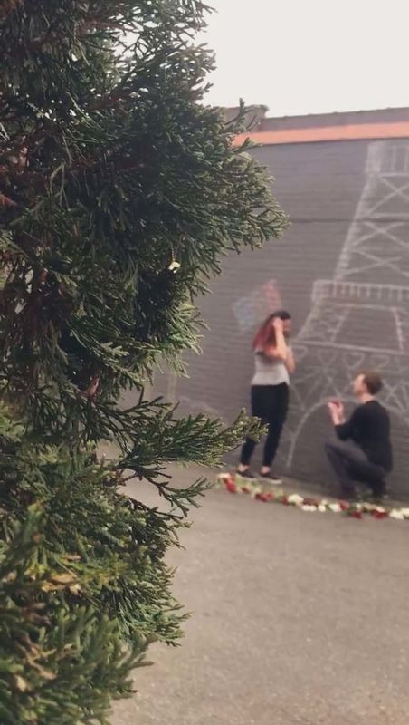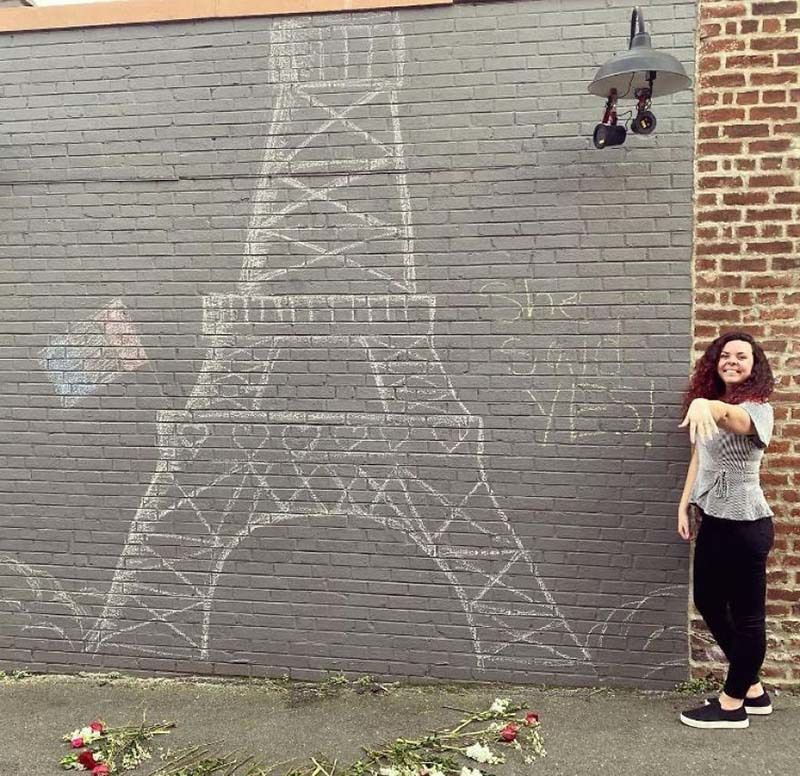 Повернувшись, він запитав, чи я не хочу прогулятися по центру міста, на що я відповіла «Так». Те, що сталося потім, нагадує сценарій з романтичного фільму: «Він відвів мене в провулок, що вів до Ринкової площі, де він намалював крейдою велике зображення Ейфелевої вежі й Тріумфальної арки. У “підніжжя” Ейфелевої вежі, по колу, він розсипав пелюстки троянди та відвів мене туди. Потім він опустився на коліно і поставив питання! Це було так мило і продумано!».