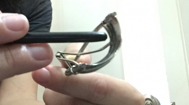 Намалюйте рівну лінію вздовж верхньої металевої планки, далі використовуйте щипці, як би вдавлюючи їх в складку століття протягом приблизно 30 секунд — вуаля, контур вій готовий!