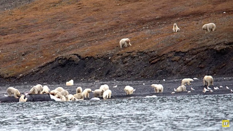 Що ж змусило таку кількість ведмедів зібратися в одному місці? Виявилося, що саме в тій частині острова викинуло на берег гренландського кита. А це означало, що як мінімум двом сотням ведмедів дістанеться відмінна здобич. Відчувши запах, вони дружно кинулися до берега.