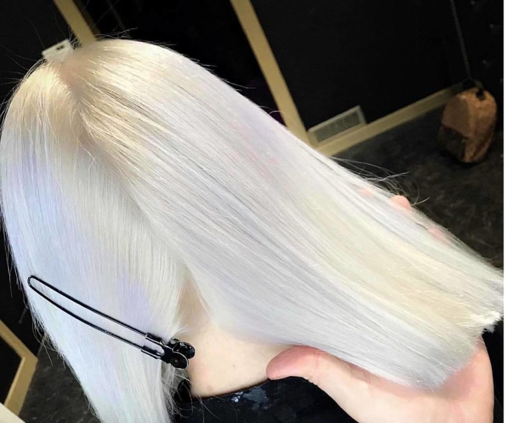 Скандинавський білий по-різному виглядає на волоссі в залежності від освітлення. Так, у будинку він буде більш подібним до платини, на вулиці – холодним білим, а при світлі софітів – майже прозорим, схожим на сніг.
