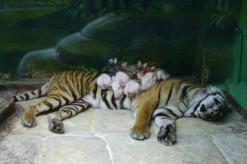 Ця історія трапилася в Таїланді більше 10 років тому. В одному із зоопарків маленького тигреня вигодувала свиня, тому коли він підріс, то став доброзичливо ставиться до всіх свинок. До Сай Май в вольєр підсадили поросят, і вони разом мило жили разом. Багато людей відвідували цей зоопарк тільки для того, щоб подивитися на цю незвичайну дружбу.
