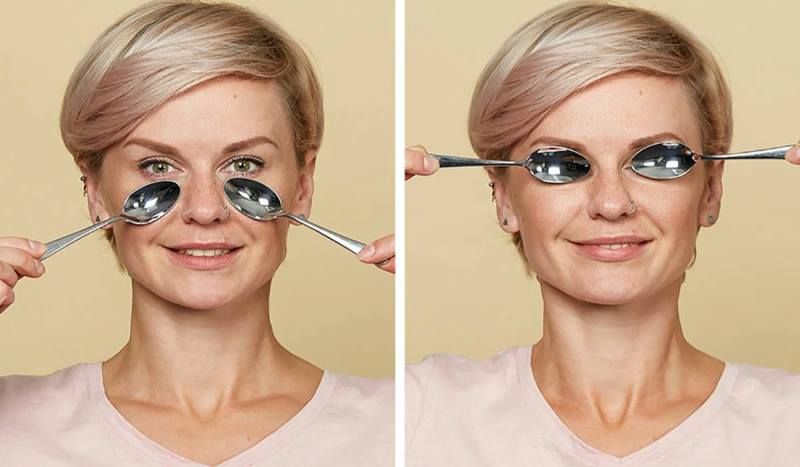 Закрийте очі і помістіть опуклу сторону холодної ложки на очі. Дайте ложкам зігрітися, опустіть їх в холодну воду і знову покладіть на очі. Повторіть 5-7 разів.