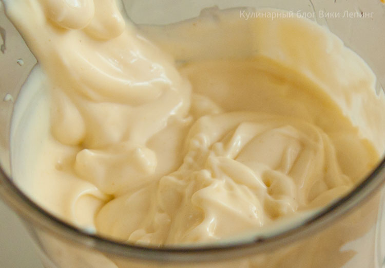 Коли маса помітно збільшиться, з краю ємності починайте вливати тоненькою цівкою рослинну олію, при цьому не перестаючи збивати масу.