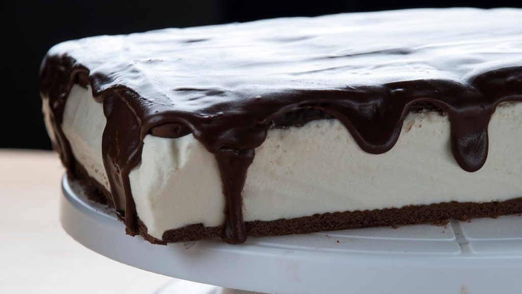 У шоколад додаємо молоко і розтоплюємо на водяній бані. Після того як торт повністю застиг, дістаємо з холодильника і поливаємо розтопленим шоколадом.