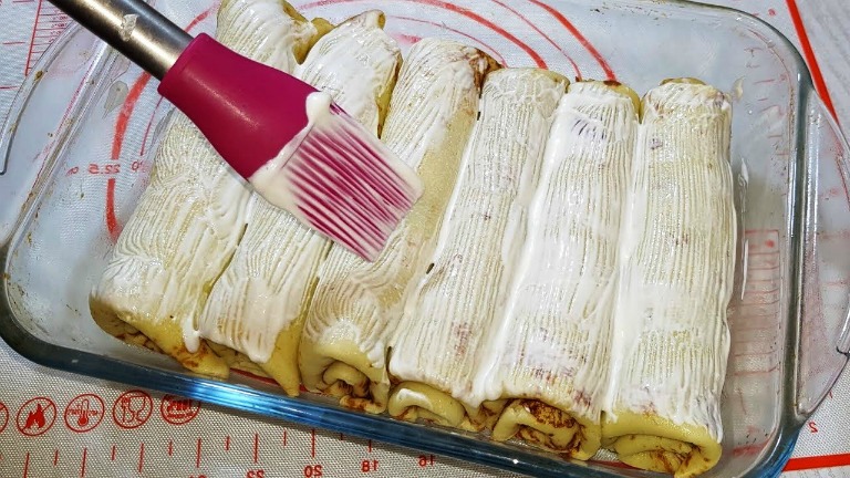 Змащуємо кожен млинець фаршем і звертаємо рулетом, підвертаючи краї.