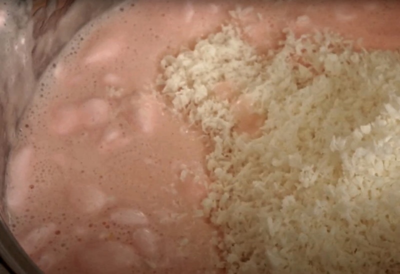 Коли маса закипить, зніміть її з вогню і додайте кокосову стружку. Все ретельно перемішайте.