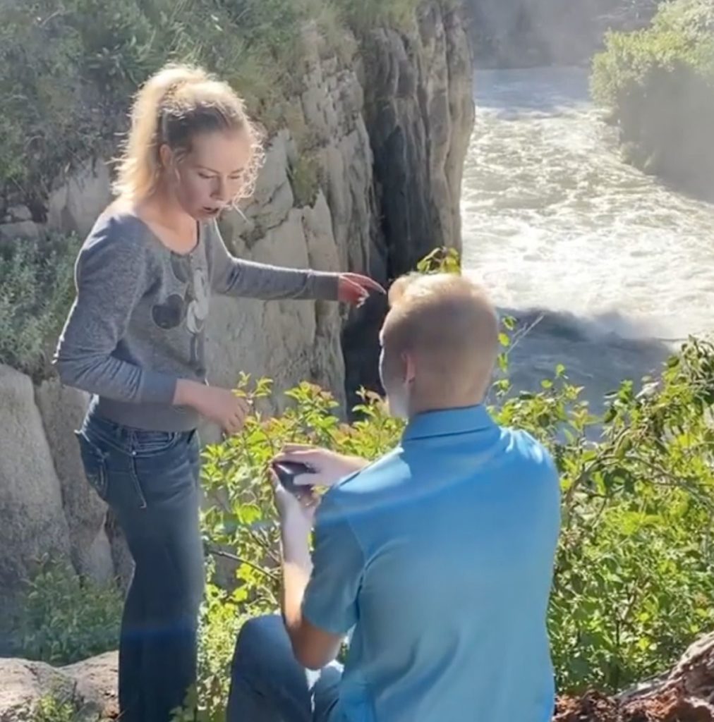 Проте зворушливий момент хлопець вирішив розбавити розіграшем і прикинувся, що заповітна коробочка з каблучкою летить прямо в бурхливі потоки водоспаду.