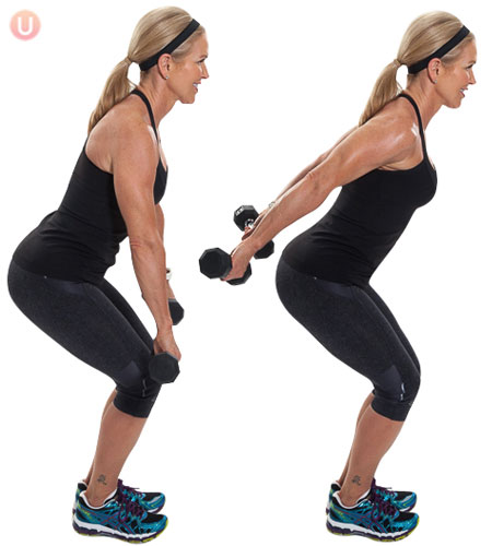 Покладіть гантелі на підлогу. Станьте в позу ноги на ширині плечей. Сядьте в легкому присіданні, зберігаючи при цьому напругу в області живота. Візьміть гантелі по боках колін. Тепер, не розмахуючи руками і не нахиляючи лікті, заведіть руки за стегна, а потім поверніться у вихідне положення.
