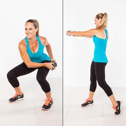 Тримайте вагу обома руками і встаньте, розставивши ноги на ширині плечей. Поверніть свій тулуб вправо і випряміть руки. Тепер підніміть руки, поки вони не будуть паралельні підлозі. Поки ви повертаєте тулуб вліво, присідайте і переносіть вагу по діагоналі, поки не наблизитеся до лівого стегна.