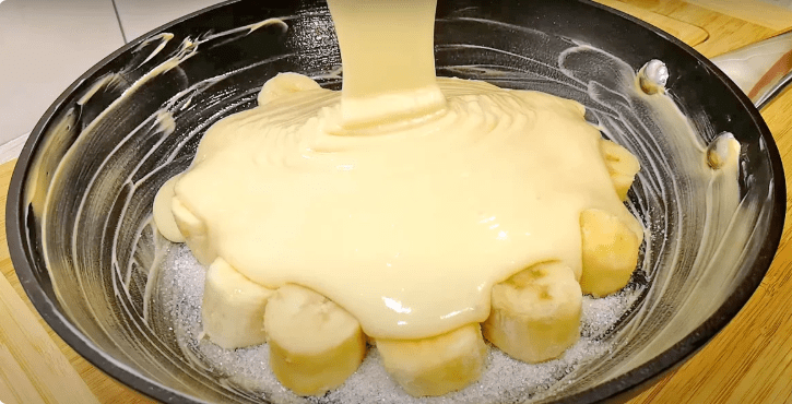 На банани вилийте тісто, вирівняйте за допомогою лопатки.