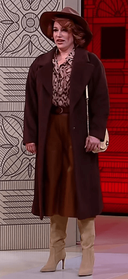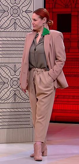 Для другого способу були підібрані модні вже кілька сезонів шкіряні штани і блуза, які доповнили класичним пальто і капелюхом.