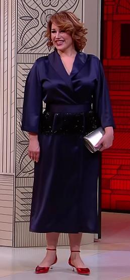 Ну а плаття для третього иходу глибокого синього кольору з басками вигідно підкреслило талію.