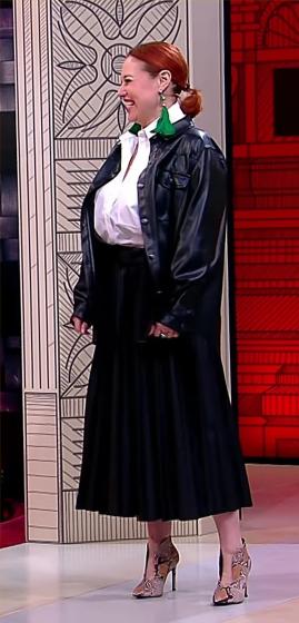 Для першого виходу Світлана вибрала образ з плісированої спідниці, класичної білої сорочки, шкіряного бомбера і оригінальних ботильйонів з анімалістичним принтом. Але ось фактури і об’ями речей погано поєднувалися між собою.