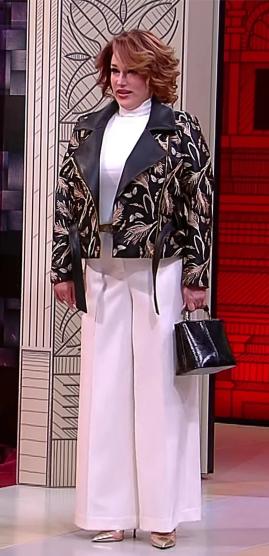 Лук total white з широких штанів і гольфу підкреслила косуха з рослинним принтом. Такий комплект допоміг підкреслити природну харизму героїні.