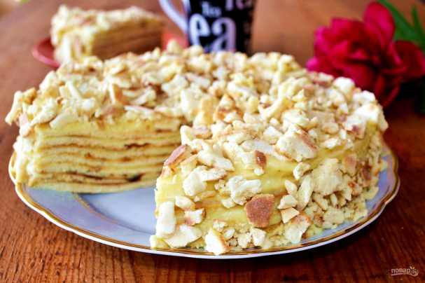 Коржі потрібно перемастити, а зверху все посипати крихтою. Залишити торт при кімнатній температурі на 1 годину, а потім ставимо в холодильник.