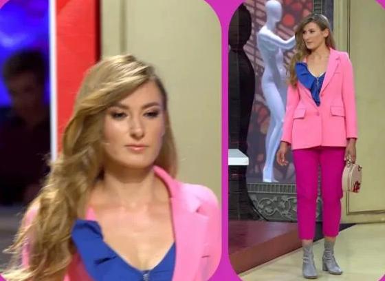 Далі вона вийшла в досить яскравому цибулі, який аудиторія зустріла з меншими оваціями. Стилісти вибрали їй малинові бриджі, синій топ з жабо і рожевий піджак. Проте все це відмінно сидить на Ксенії.