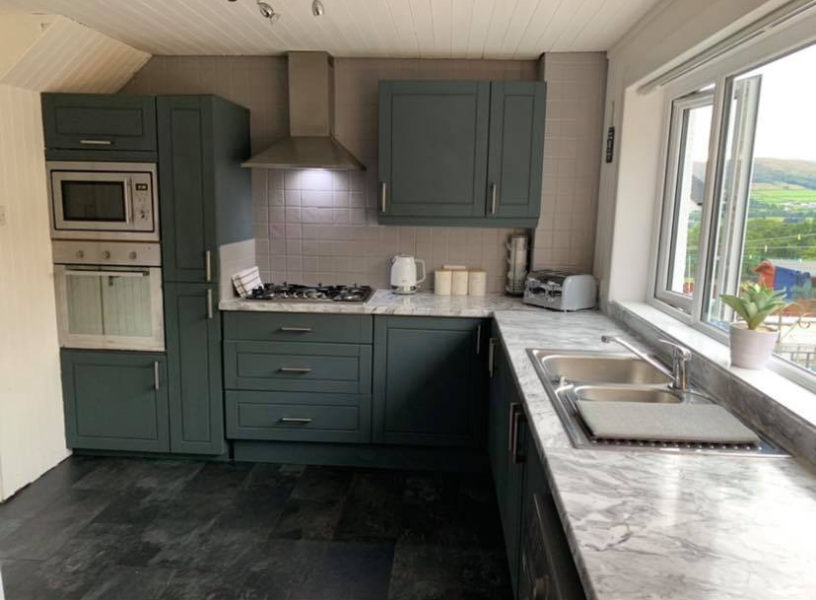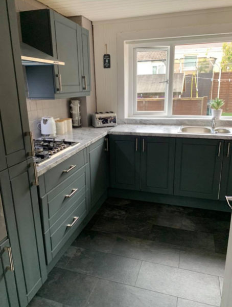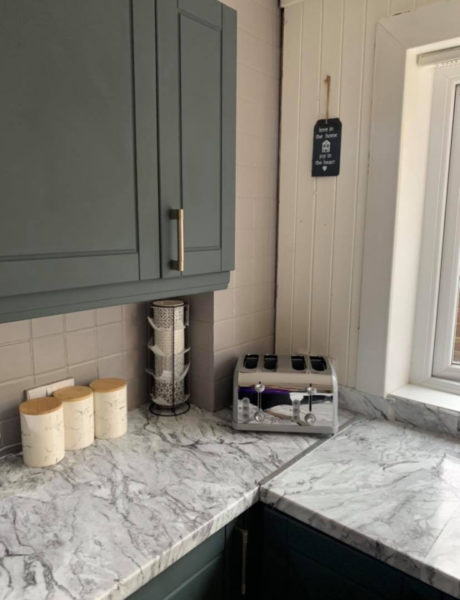 Далі Кімберлі вирішила пофарбувати гарнітур. Причому як нижні, так і верхні шафи. Для цього вона вибрала насичений відтінок сіро-зеленого, що приємно контрастує з новим кольором стін. Стільницю, яка раніше була коричневою, вона покрила самоклейкою вінілової плівкою.