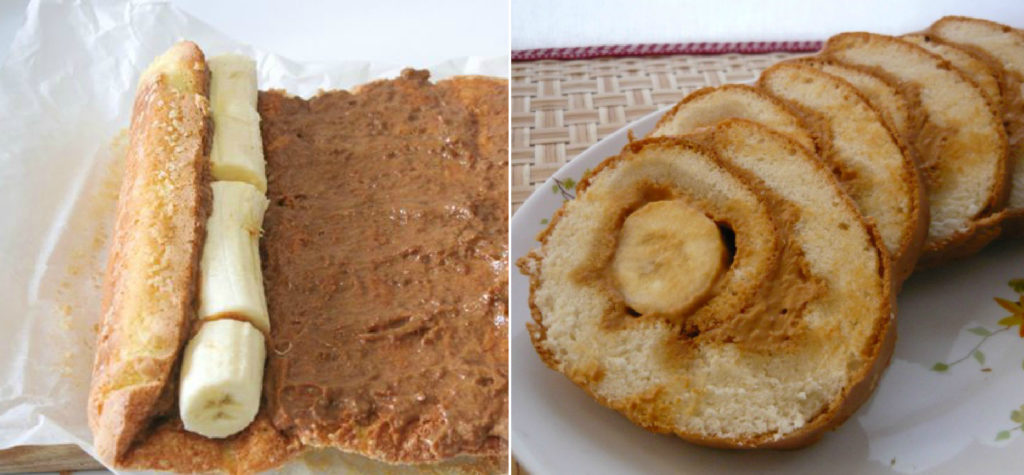 В середину покладіть почищений банан та загорніть рулетом.