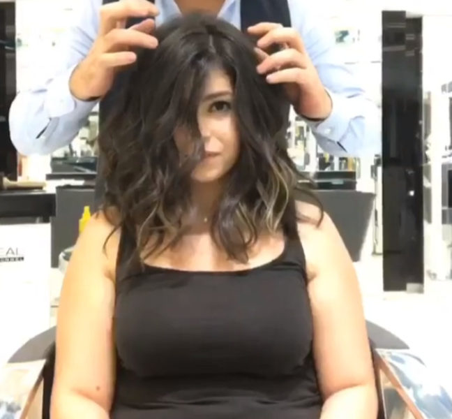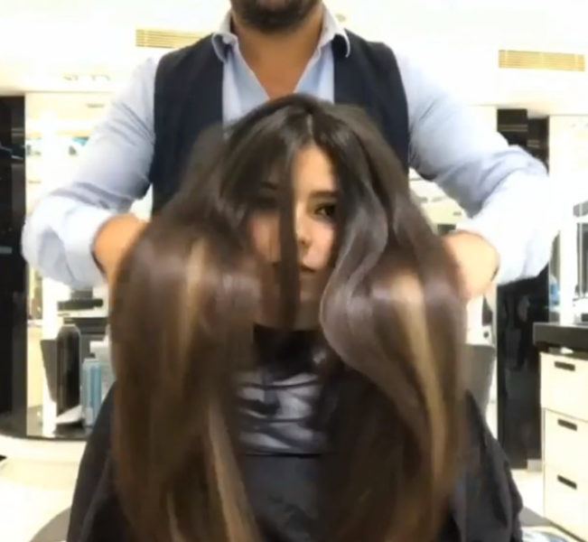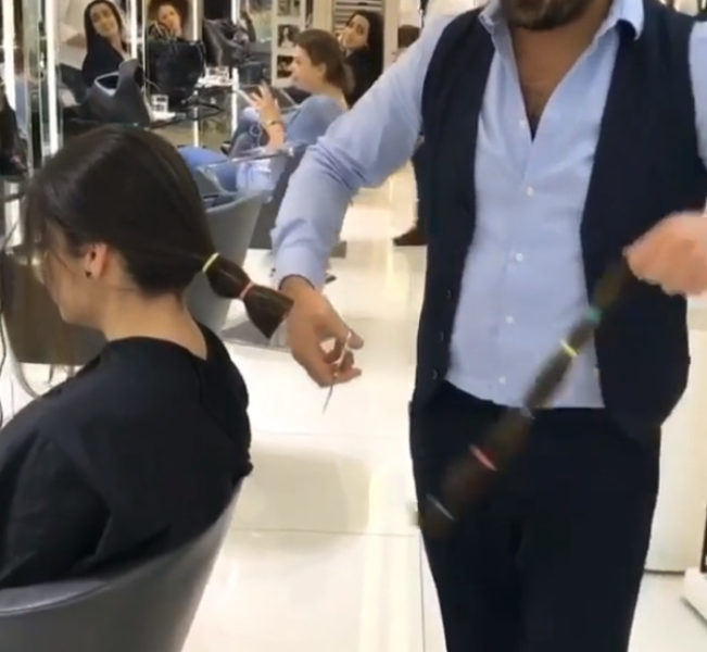 Майстер спочатку зібрав волосся в хвіст, перехопивши його гумками в декількох місцях. Потім Мунір впевненим і швидким рухом відрізав практично півметровий кінець і вручив його власниці. Дівчина, побачивши в руках власне волосся, ледь не розплакалася. Але такі емоції тривали недовго: перукар продовжив роботу і продемонстрував результат.