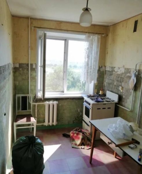 Фотографії “До” показують, що ремонту в квартирі не було давно. Радянська плитка під шпалерами, стара підлога – було вирішено почати саме з неї. Потім вирішили прибрати з маленької кухні гарнітур, поставити замість старих вікон пластикові пакети.