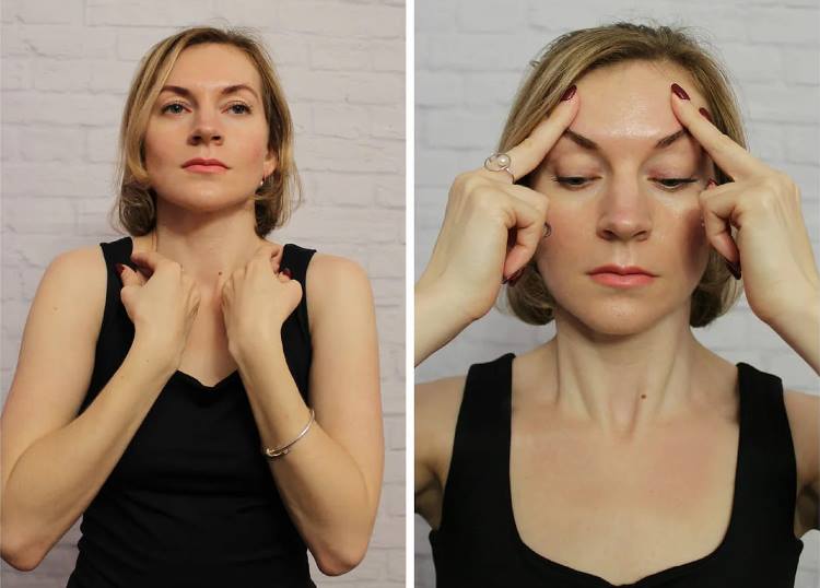 Далі продавлюють великими пальцями м’яку зону безпосередньо над ключицями. Масаж дає ефект ліфтингу і знімає набряки. Краще робити вранці і з позитивними думками, я зазвичай роблю самомасаж біля вікна, милуючись ранковим містом.