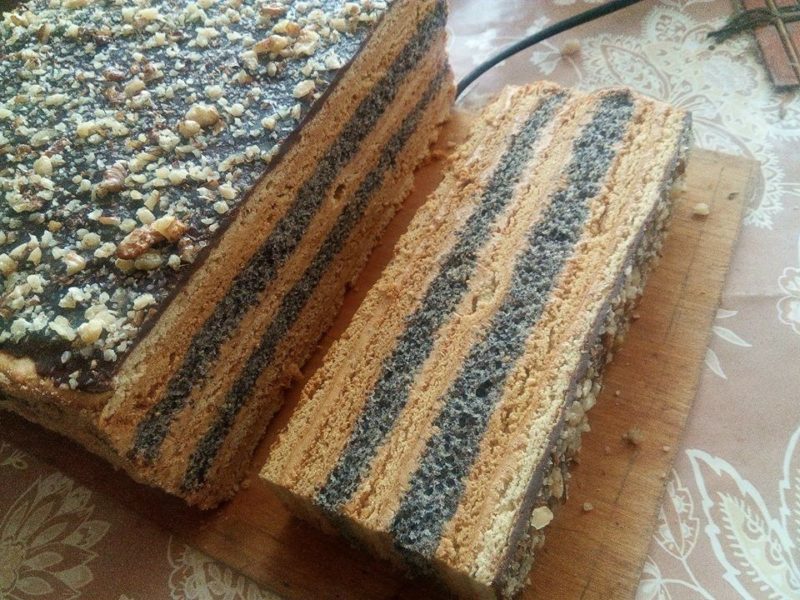 Збити вершкове масло й змішати разом зі згущеним молоком. Складаємо корж у такій послідовності: 2 медові – 1 маковий – 1 медовий – 1 маковий – 2 медових. Підрівняти краї.