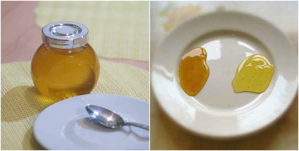 Візьміть чайну ложечку та запхайте у банку з медом. Натуральний мед буде намотуватись на ложку, а підроблений — буде одразу ж стікати.