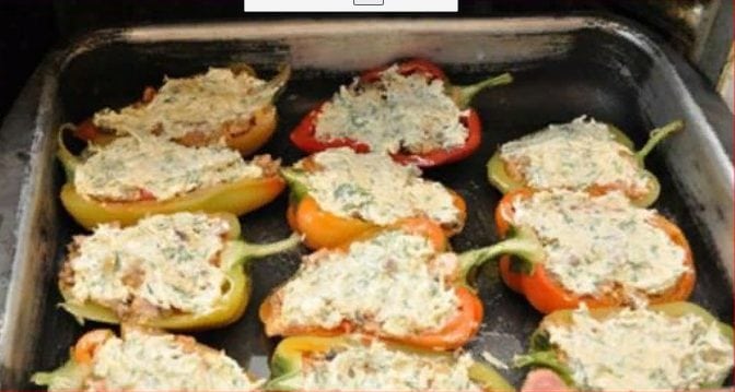 На деко викласти порізані навпіл перці, накласти в них начинку.