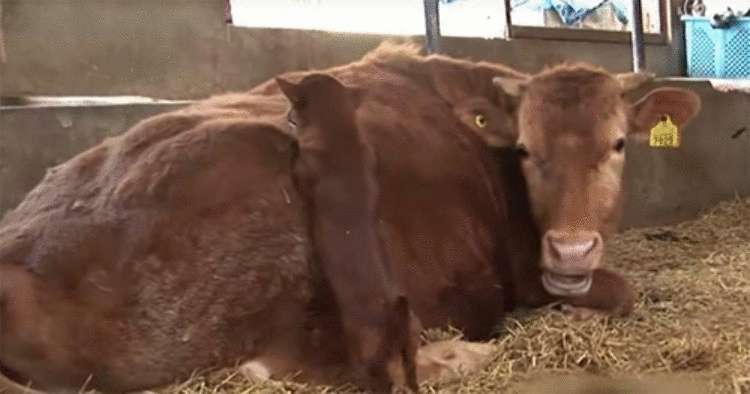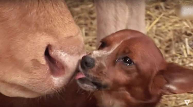 Він бігав кругом людей, які виводили корову з хліва, і шалено гавкав. В один момент пес підбіг до неї і облизав їй мордочку. Корова теж відповіла одному взаємністю.