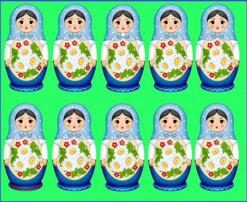 На цій картинці потрібно знайти трьох матрьошок, які відрізняються від всіх інших. Всього матрьошок 10. Зосередьтеся і виконуйте завдання!